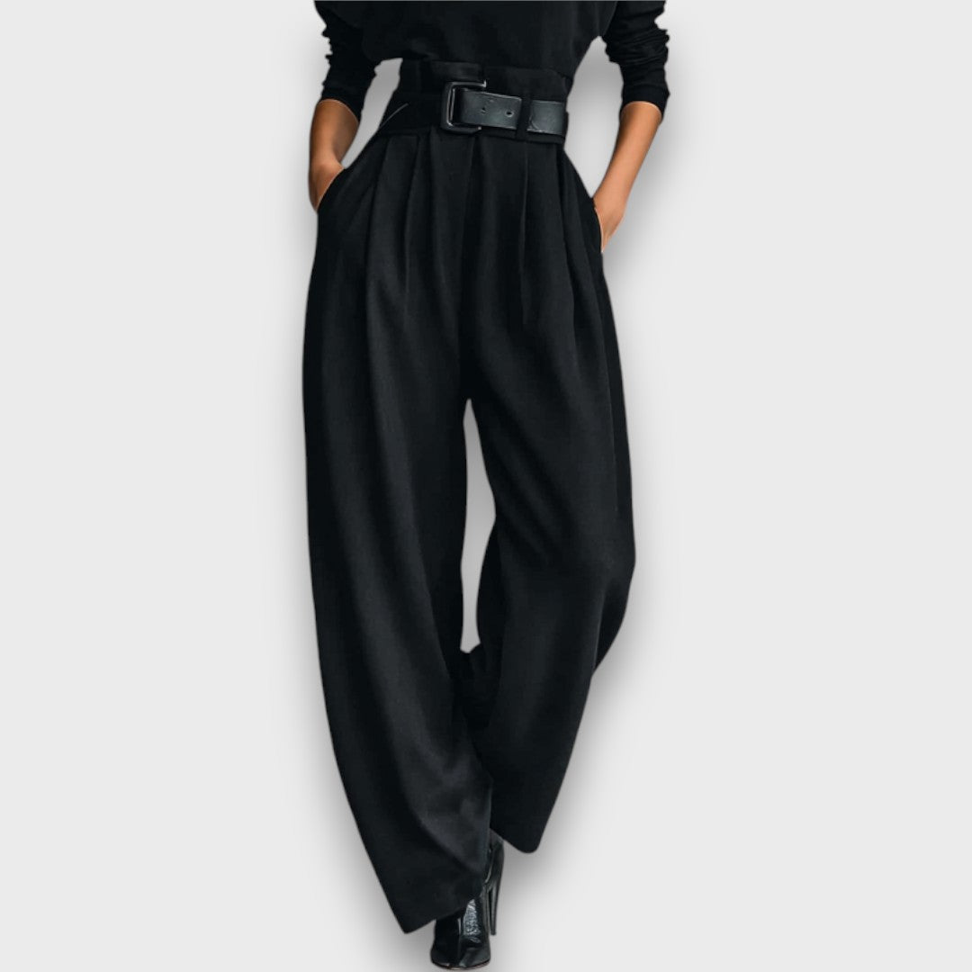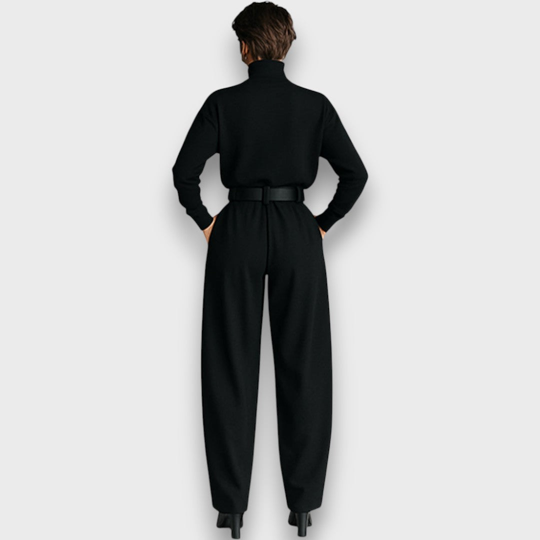 Schlichte Eleganz trifft auf moderne Linien: Das schwarze Oberteil mit langem Arm und hohem Kragen strahlt zeitlose Raffinesse aus, während die weit geschnittene Hose eine fließende Silhouette kreiert. Gemeinsam entsteht ein Look, der Minimalismus und Stärke in perfekter Harmonie verbindet.