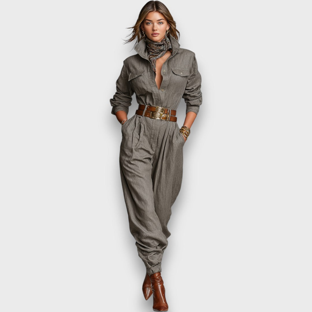 Ein Ensemble, das Stärke und Weiblichkeit zugleich verkörpert: Dieses zweiteilige Set mit Hemd und Hose in fließender Passform bringt Eleganz und Komfort in Einklang. Die langen Ärmel, der markante Kragen und die betonte Taille verleihen dem Look einen modernen Utility-Touch, während die lockere Silhouette für Bewegungsfreiheit sorgt.